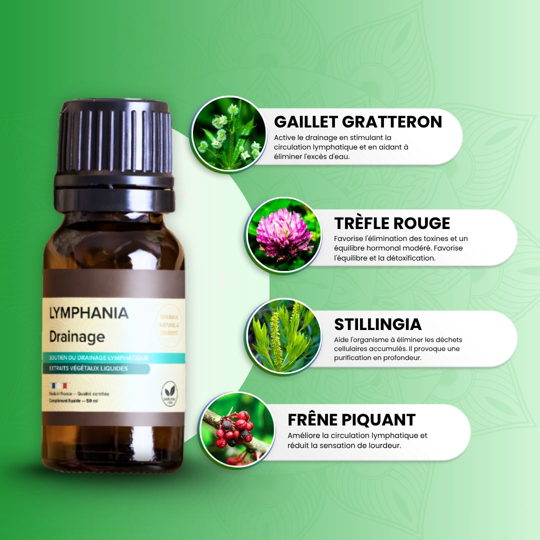 4 extraits botaniques choisis pour stimuler naturellement le drainage lymphatique et rétablir l’équilibre du corps.